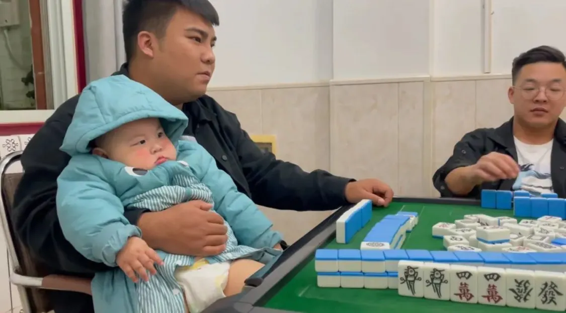 爸爸抱着打麻将,他目不转睛地盯着,也不伸手捣乱。