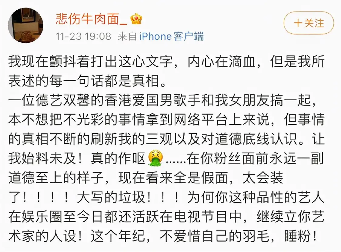 之前一位名叫“悲伤牛肉面”的网友爆谭咏麟“黑料”。