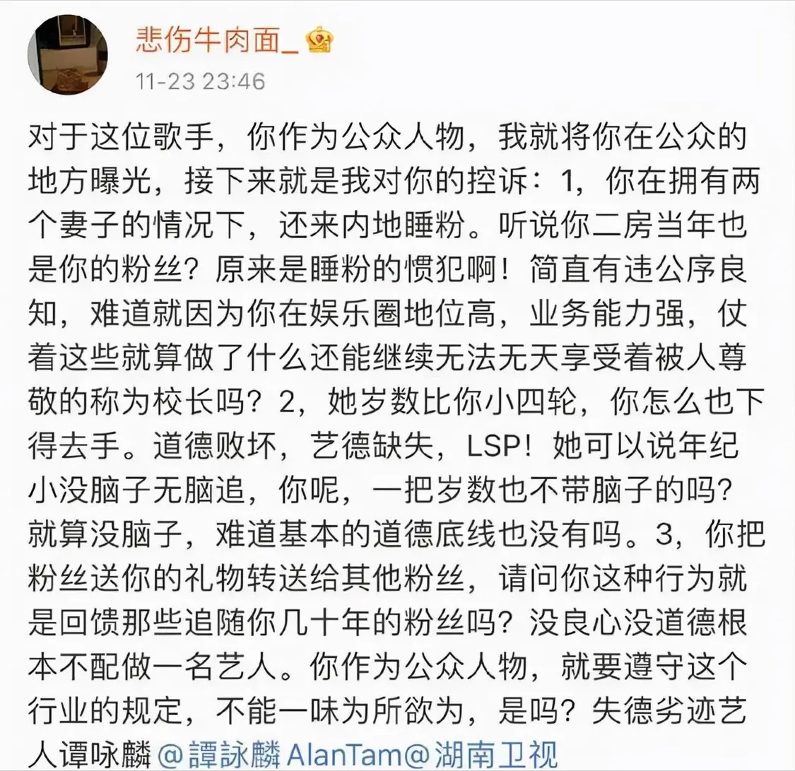 发的小作文字字都在控诉谭咏麟道德败坏,没有艺德。