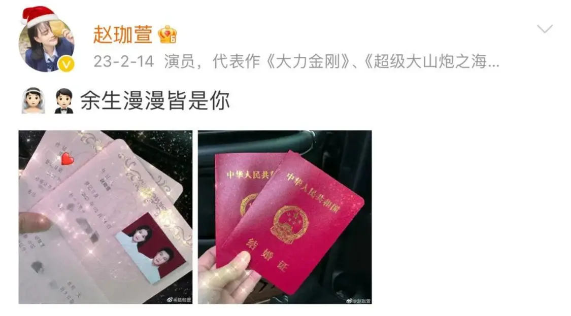 去年情人节当天,晒出了结婚证,正式官宣结婚。