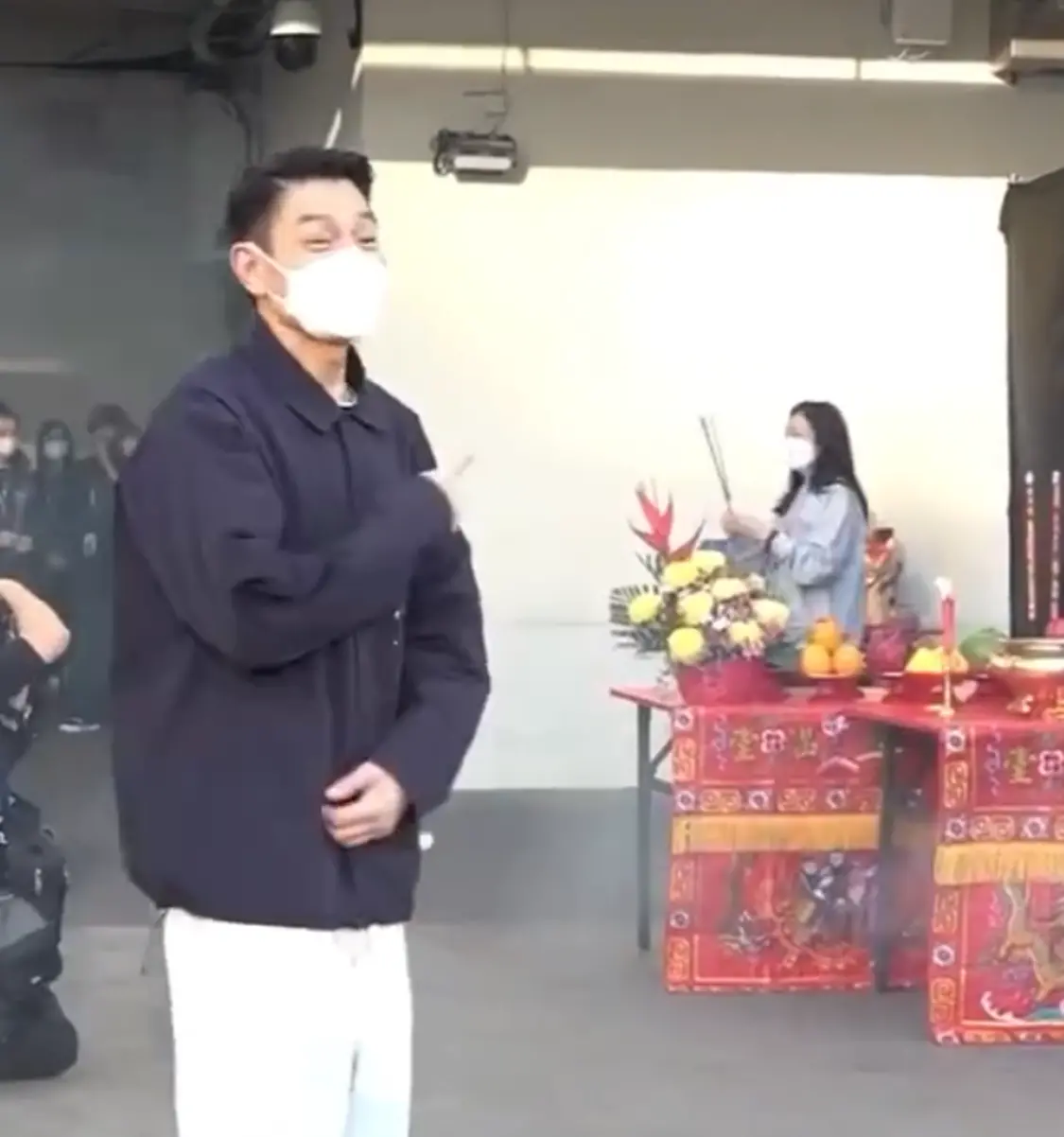 在此期间,华仔几乎是静止的,全神贯注看着太太拜神,朱丽蒨则不紧不慢,烧香拜佛近一分半才完成所有仪式,看到太太完成工作后,刘德华才转过身与歌迷互动。