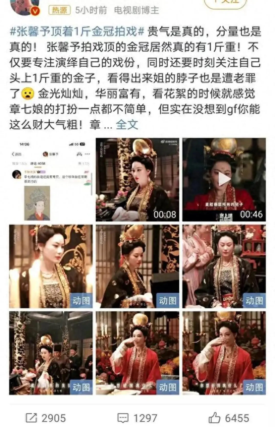 最近,#张馨予顶着1斤金冠拍戏#上了热搜,原来张馨予在电视剧《清明上河图》中饰演富商之女,因头戴一斤重头冠拍戏引热议。网友赞其敬业,也盼剧组关怀演员健康。
