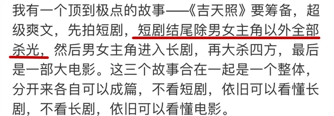 “超级爽文,先拍短剧,短剧结尾除男女主角以外全部杀光,然后男女主角进入长剧,再大杀四方,最后是一部大电影”