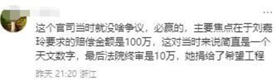 “当年这场官司没啥争议的,主要焦点在于刘嘉玲要求的赔偿金是100万,这简直就是天文数字。”