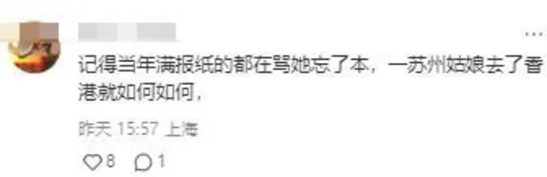 这条帖文一出,勾起不少上了年纪网友的回忆。有网友说记得当年满报纸都在骂她忘了本,一个苏州姑娘去了香港就如何如何。