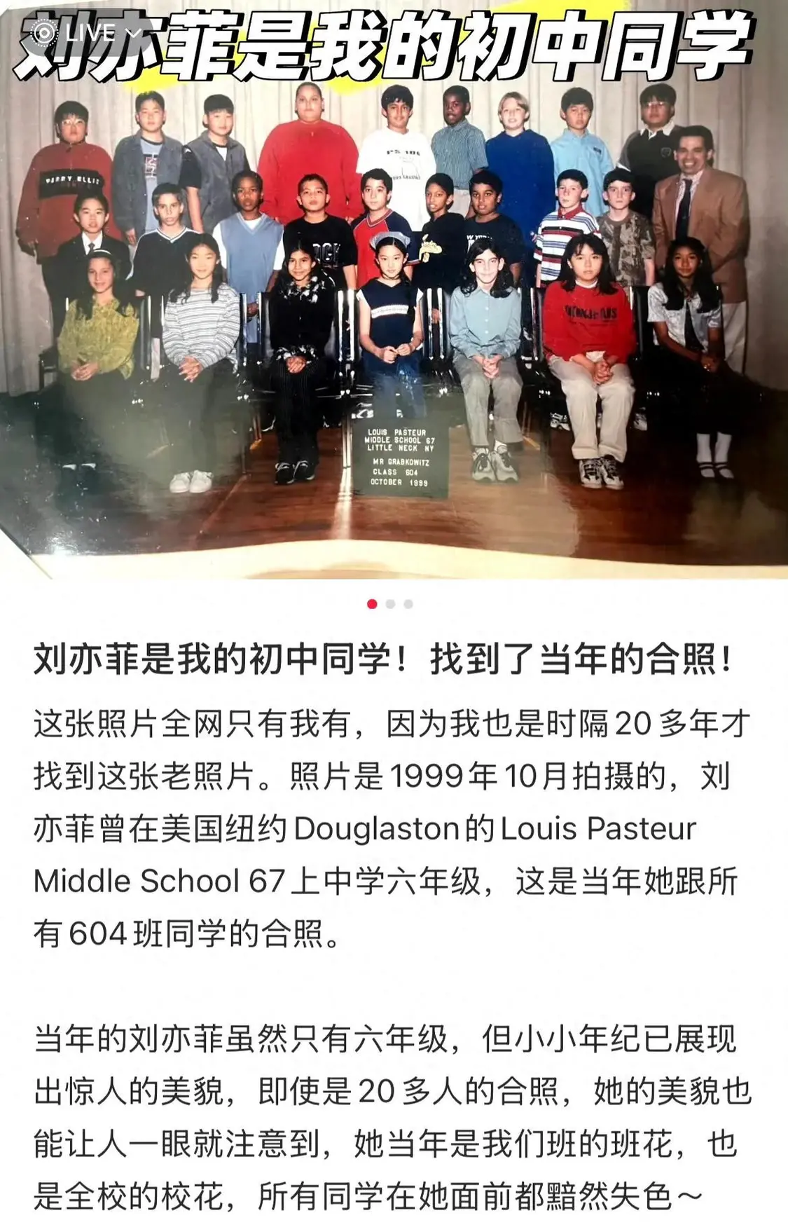 博主配文:这是刘亦菲在美国纽约读中学六年级时的班级合照。