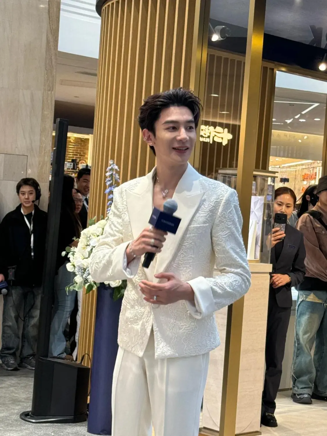 当时他穿着白色的西装,发型吹得十分张扬,脸上带着标准的笑容,就连他的胳膊还放在腰后,看起来十分“敬业”的样子。