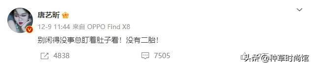 唐艺昕很快在社交账号上发文回应:“别闲得没事总盯着肚子看!没有二胎!” 果断否认了这一传闻,暂时平息了风波。