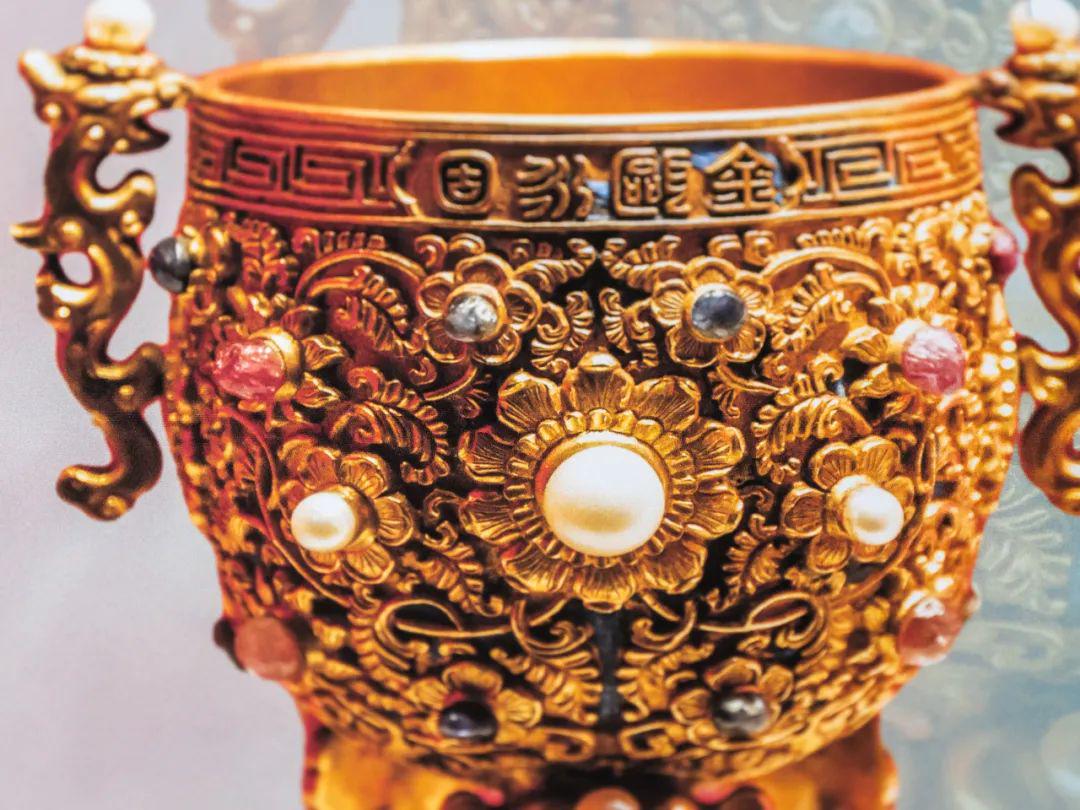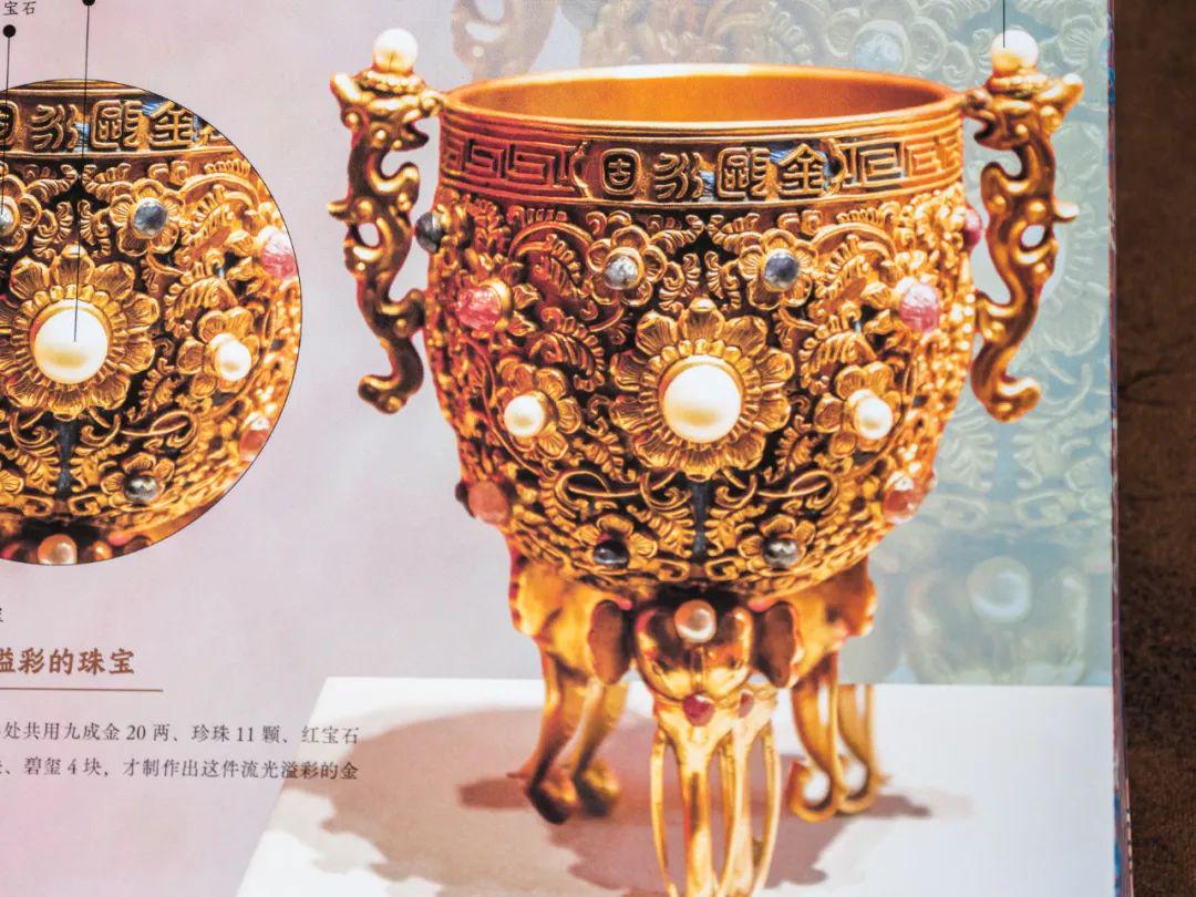 金瓯永固杯上的11颗珍珠,9块红宝石,12块蓝宝石,近在眼前。
