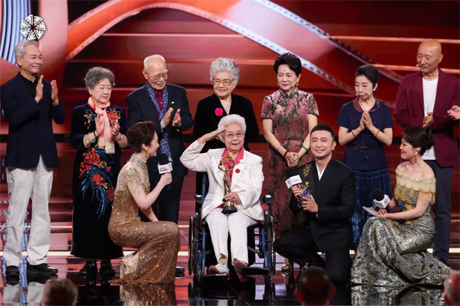 今年的终身成就奖颁发给了曾出演《白毛女》、《党的女儿》的艺术家田华老师,包括她的学生陈佩斯、朱时茂,曾经的合作伙伴都纷纷到场,为田华老师颁奖。