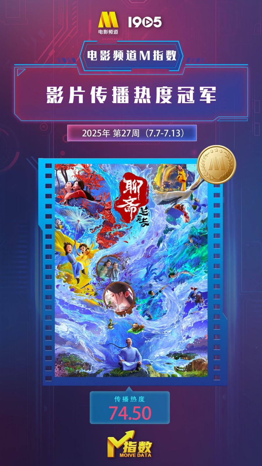 电影频道M指数2025年第27周结果发布。7月7日-7月13日,电影频道M指数热映影片传播热度榜前6位依次为: