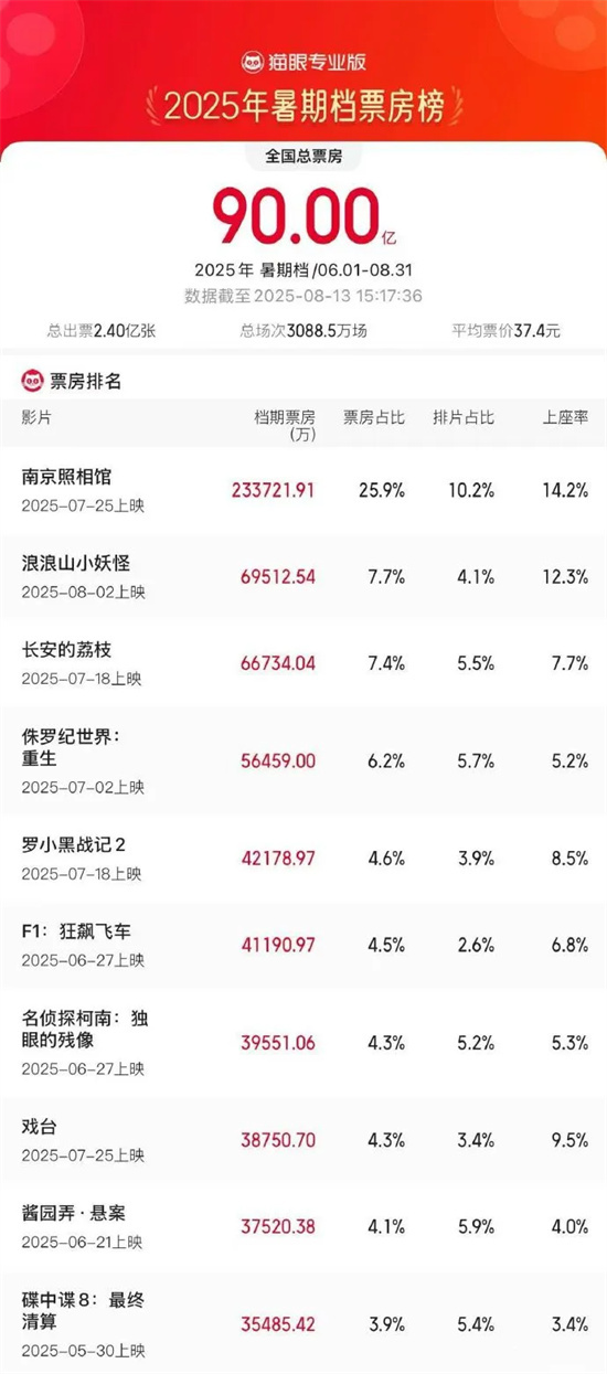 新片入局、老片发力,暑期档大盘截至8月13日成功突破90亿大关。