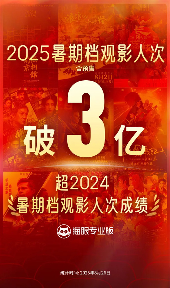 据网络平台数据显示,截至8月26日16时49分,2025年暑期档(6月-8月)总观影人次(含预售)突破3亿,已超过2024年暑期档最终观影人次(2.85亿)。