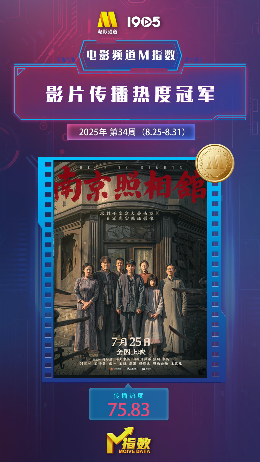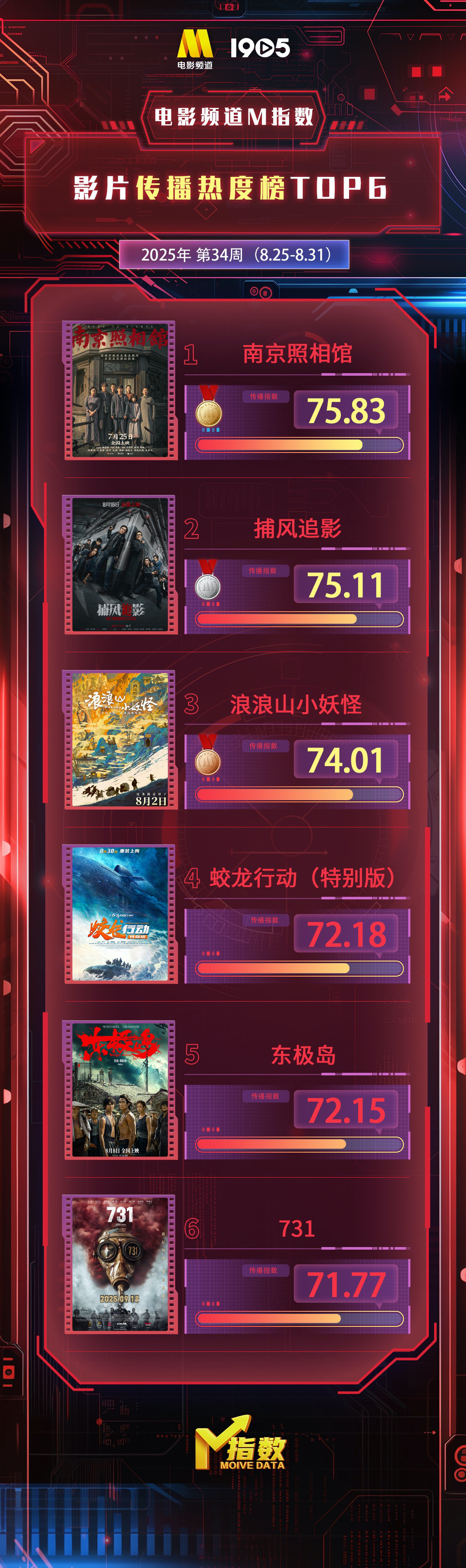 电影频道M指数2025年第34周结果发布。8月25日-8月31日,电影频道M指数热映影片传播热度榜前6位依次为: