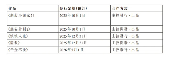 猫眼主控发行及出品的新片片单包括:国庆档的《志愿军:浴血和平》《刺杀小说家2》《熊猫计划2》;10月31日上映的《即兴谋杀》;跨年档的《浪浪人生》《匿杀》;2026年五一档的《千金不换》。