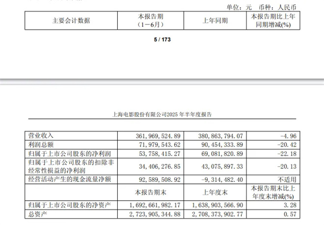 上海电影上半年营收3.62亿元,净利润5376万元,主要收入来自院线和影院经营。