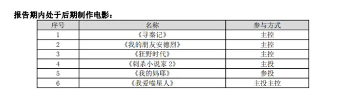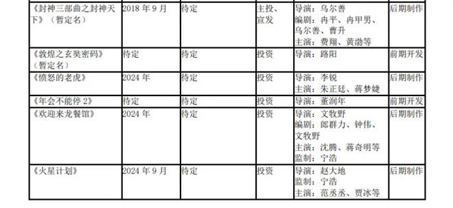 待映项目包括刘伟强执导的年代谍战大片《克什米尔公主号》、重大革命历史题材影片《四渡》,以及曹保平执导的犯罪悬疑片《她杀》,都已经进入后期制作阶段。