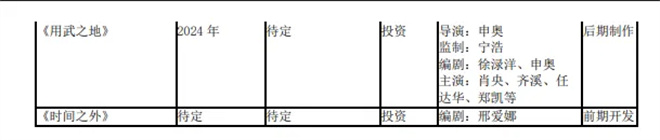 路阳导演的《敦煌之玄奘密码》(暂定名),董润年导演的《年会不能停!2》,邢爱娜编剧的《时间之外》也在推进开发,朱正廷、蒋梦婕主演的《愤怒的老虎》正在后期制作。