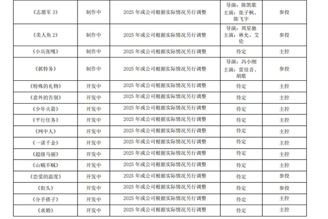 公司暑期档出品《长安的荔枝》,后续参投《志愿军:浴血和平》,《抓特务》已杀青,周星驰导演的《美人鱼2》依旧处于后期制作。