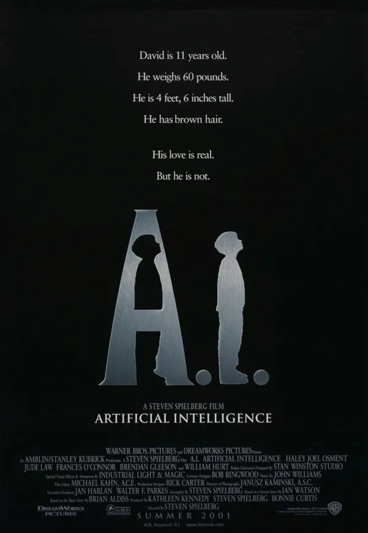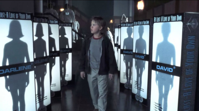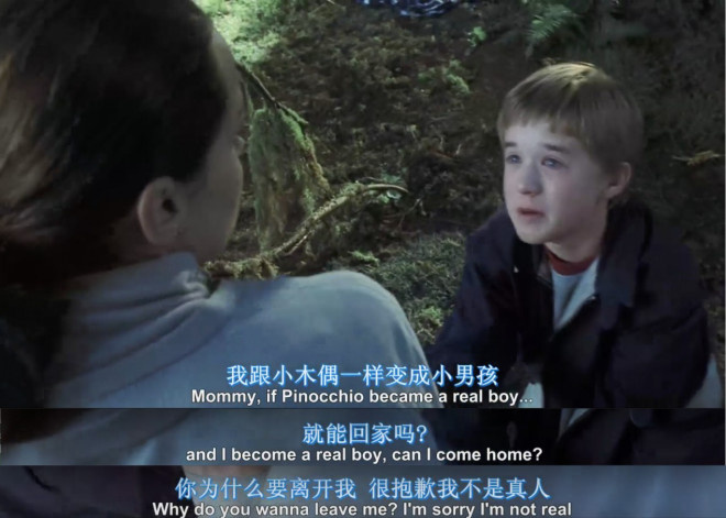 一脸天真的小机器人大卫,面对打算抛弃他的人类母亲,苦苦哀求:如果我像《木偶奇遇记》里的匹诺曹一样,变成了真人孩子,你是不是可以像爱你的亲生儿子一样爱我?