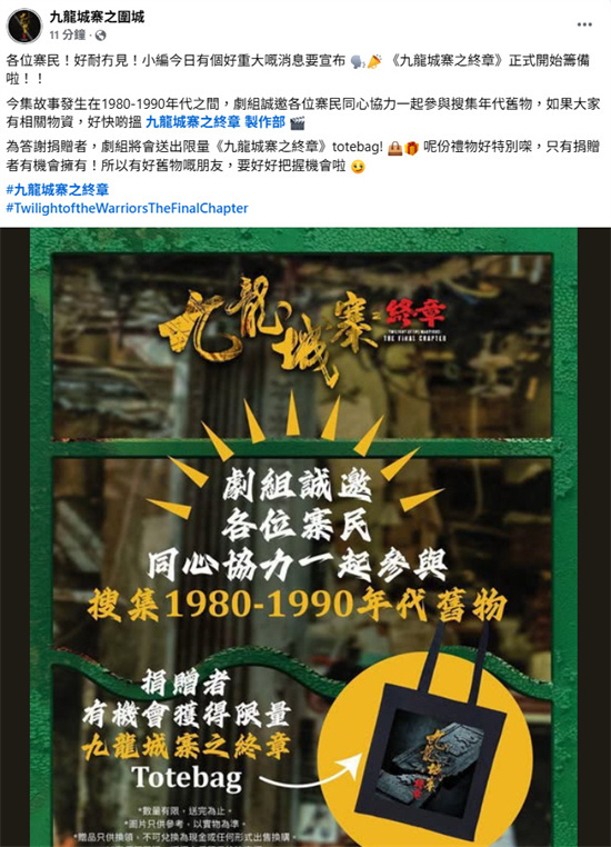 近日,电影《九龙城寨之围城》的续集电影《九龙城寨之终章》在社交媒体上宣布,影片已正式开始筹备,将讲述发生在1980-1990年代之间的故事。影片同时发布告示向影迷征集年代旧物,以支援影片拍摄。