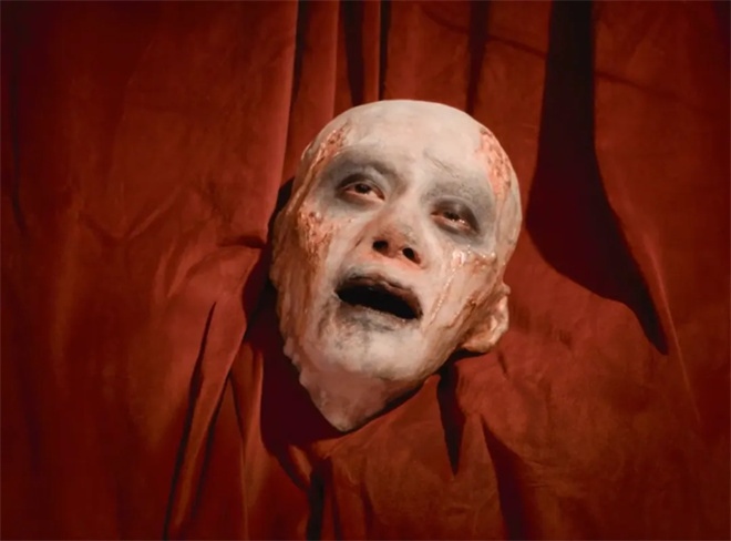 他在红幕布前露出一张面孔,像电影《圣女贞德蒙难记》里的贞德那样落泪。虽然迷魂者的样貌丑陋,却如贞德般圣洁。