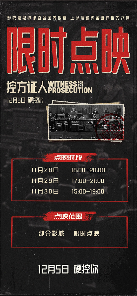 影史悬疑经典《控方证人》发布中文配音版终极预告,并宣布将于11月28日至30日开启提前点映,12月5日起全国正式上映。影片由推理女王阿加莎克里斯蒂原著改编,奥斯卡导演比利怀尔德执导,此次国语译制版更是集结上海电影译制厂豪华阵容重磅献声。