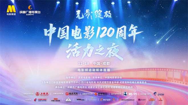 光影绽放,活力全开。12月18日,光影绽放中国电影120周年活力之夜在成都高新体育中心燃情上演,百位电影人、音乐人齐聚活力之城成都,带来一场面向未来、酣畅淋漓的中国电影出征仪式。活动由国家电影局指导,中国电影家协会支持,中宣部电影频道节目中心、四川省电影局、中共成都市委宣传部、成都高新区党工委管委会主办,成都市广播电视台、成都武侯区委区政府、成都郫都区委区政府承办。