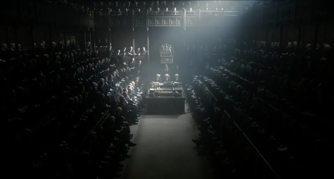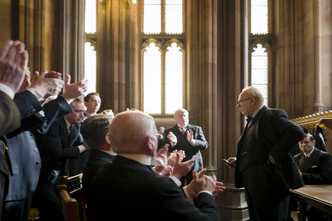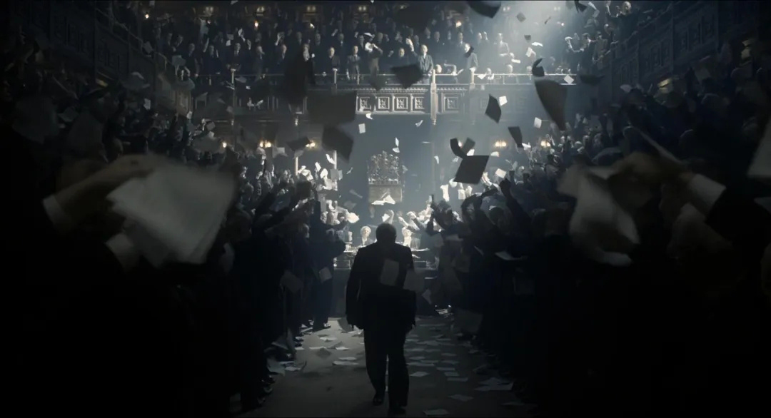 片头丘吉尔第一次演讲,左右议员万马齐喑;影片高潮处丘吉尔演讲,表示支持的白色票券如雪片般洒落,这一高燃名场面自此写入二战题材影史。