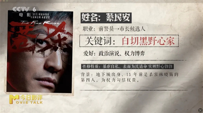 柯汶利称其为白切黑野心家。蔡民安因童年火灾经历变得偏激,自认为地下城人们的牺牲是值得的,其恶行包裹着自以为崇高的理由,显得立体而危险。