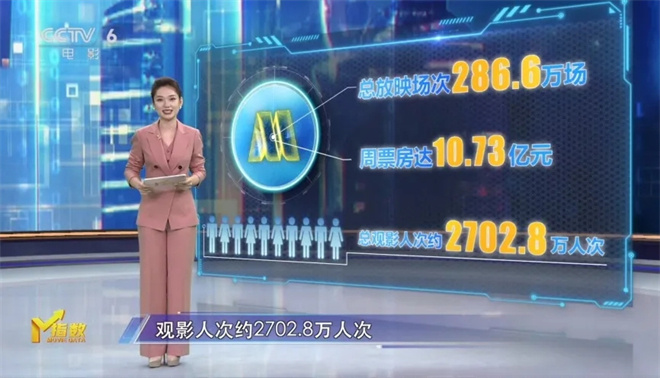 据M大数据统计,上周共上映11部影片。大盘数据显示,在过去的一周里,全国院线放映总场次达286.6万场,周票房达10.73亿元,观影人次约2702.8万人次。