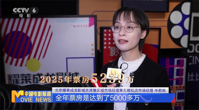北京耀莱成龙影城京津豫区域市场经理兼五棵松店市场经理岑君岚介绍,影院全年票房达到5239万,接待人次97.1万人次。单日票房最高出现在大年初一,当天票房突破100万,整个春节档表现也最好,票房接近600万。