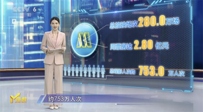 据M大数据统计,上周共上映8部影片,大盘数据显示,在过去的一周里,全国院线放映总场次达280万场,周票房达2.8亿元,观影人次约753万人次。