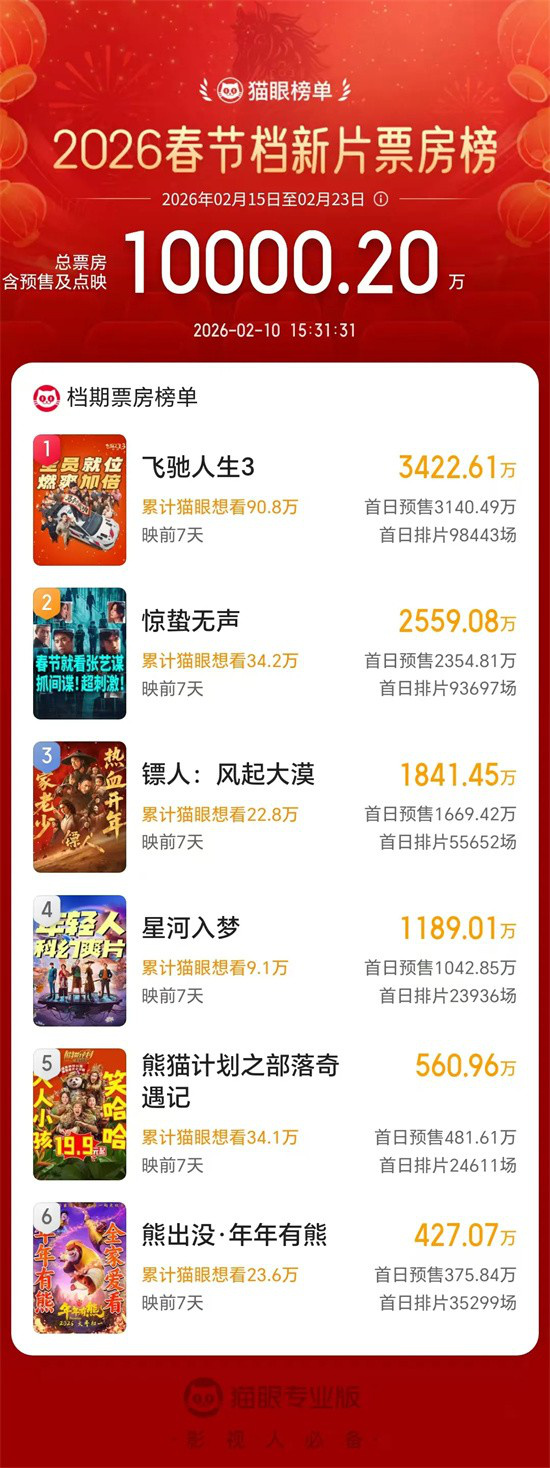 《飞驰人生3》《惊蛰无声》《镖人:风起大漠》目前位列预售榜前三;《星河入梦》《熊猫计划之部落奇遇记》《熊出没年年有熊》紧随其后,热度持续攀升。