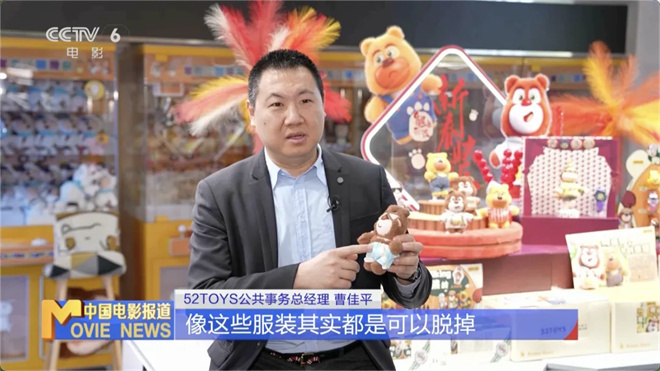 52TOYS公共事务总经理曹佳平表示,影视周边IP大约在2024、2025年开始火热,他们提前一年时间与熊出没IP授权方沟通。像我手中拿的这种搪胶毛绒,像这些服装其实都是可以脱掉、替换的,墨镜都是可以取下来调整的。他指出,这类产品形态可爱,增加了用户的互动性与可玩性。