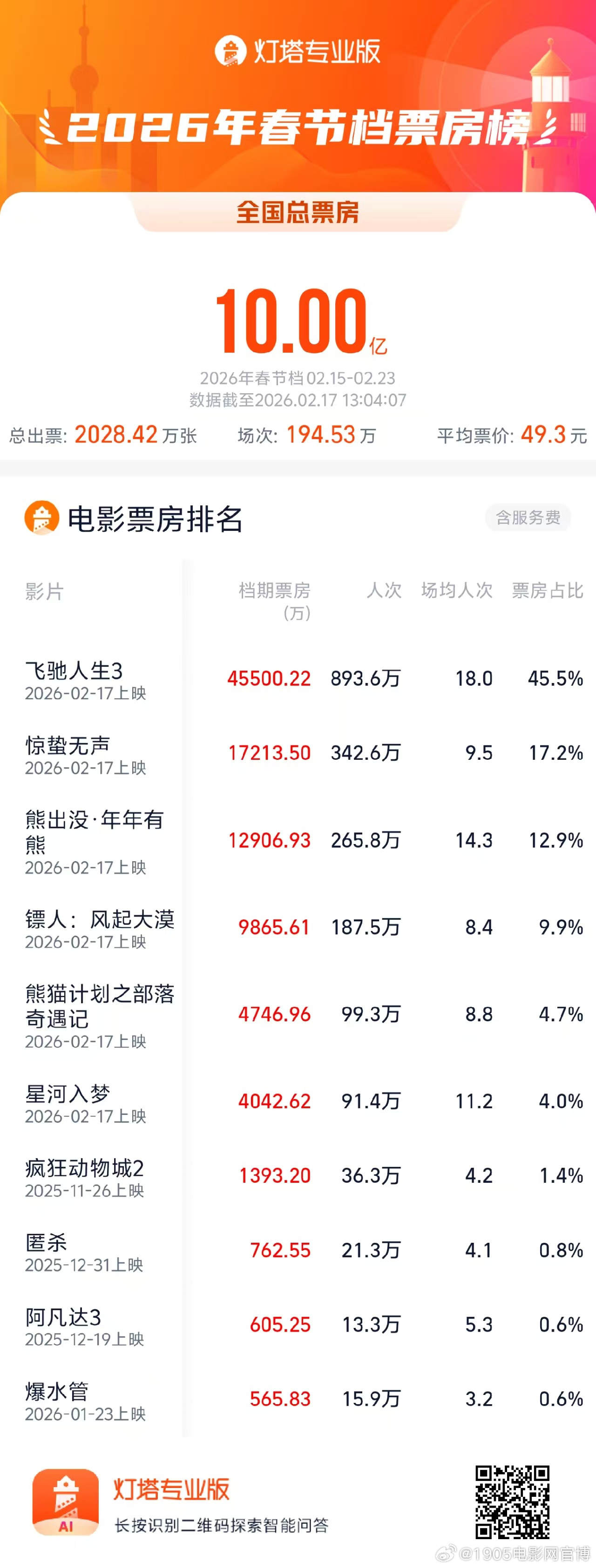 2026春节档累计票房破10亿!《飞驰人生3》居首