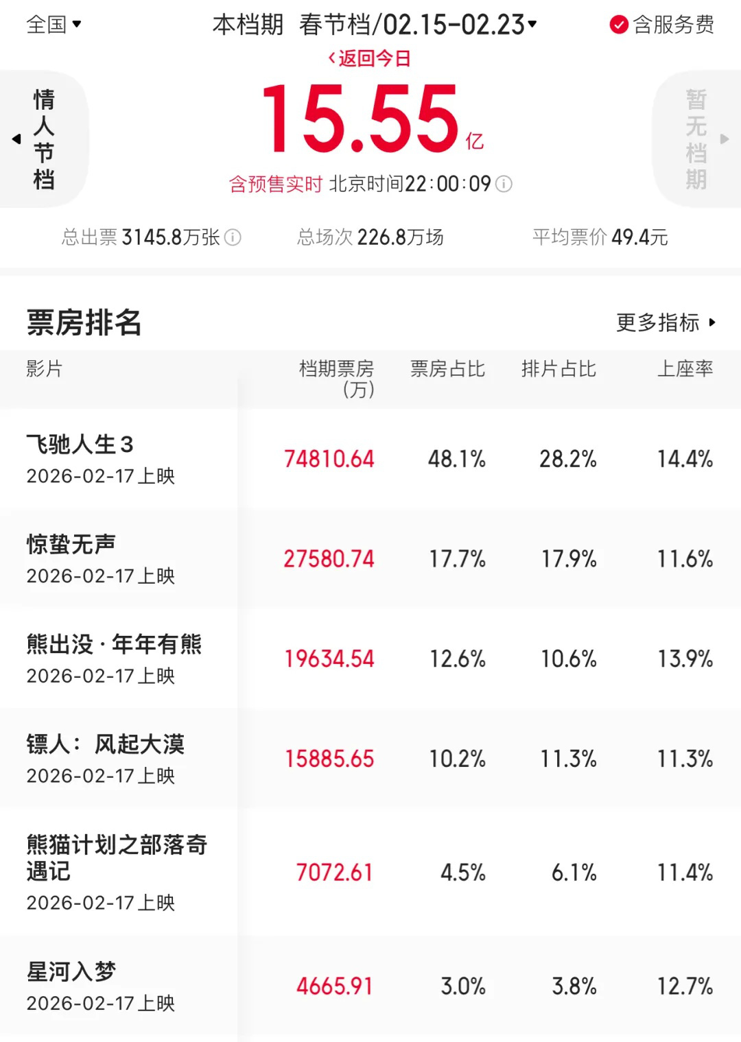 随着首日战报出炉,2026年春节档档期总票房(含预售)已达15.5亿。六部影片目前的档期总票房与大年初一单日票房的排位一致,但真正的长线鏖战才刚刚开始。
