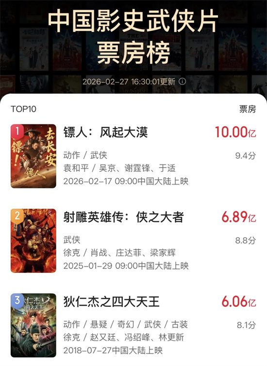 截至发稿,《镖人:风起大漠》累计票房突破10亿。随着口碑发酵,该片在春节档单日票房连续逆跌,并斩获中国影史武侠片票房冠军。