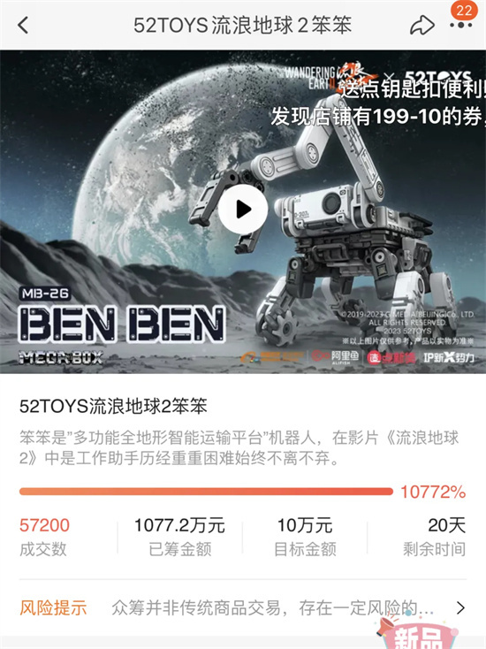彼时,中国电影股份有限公司营销公司副总经理朱海荣曾预测,如果《流浪地球》继续拍第二、第三部,衍生产品的价值将达到几十亿。而到了《流浪地球2》,实际甚至超出预测,单款衍生品众筹就破亿,衍生产品品类远超上百种。