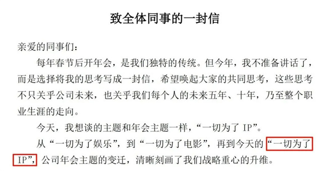 正如光线传媒在今年内部年会上反复强调的一切为了IP,将IP明确写入公司未来几年的核心战略中,不再只是内容部门的创作方向,而是覆盖投资、制作、开发乃至长期运营的总纲。