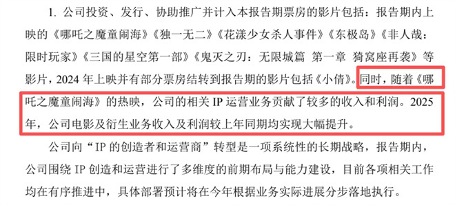 公司在《2025年度业绩预告》中提到,公司归属于上市公司股东的净利润为15亿元19亿元,随着《哪吒之魔童闹海》的热映,公司的相关IP运营业务贡献了较多的收入和利润。2025年,公司电影及衍生业务收入及利润较上年同期均实现大幅提升。