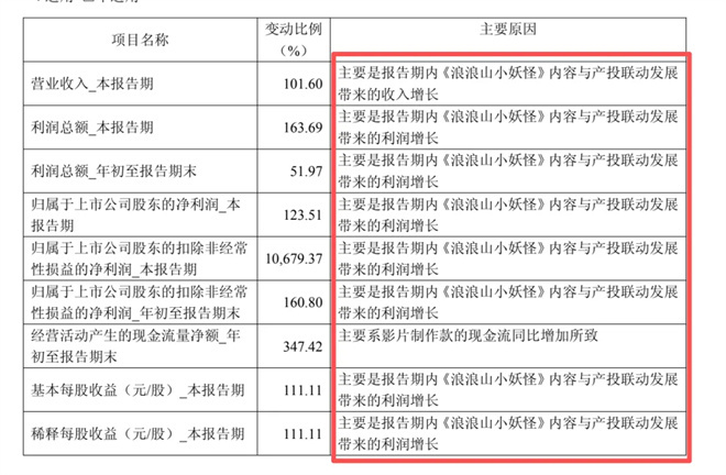 相关收益在同年后续财报中得到体现,尤其是在第三季度报告中,整体营业收入和利润总额都达到了较高比例,主要原因是报告期内《浪浪山小妖怪》内容与产投联动发展带来的收入增长。